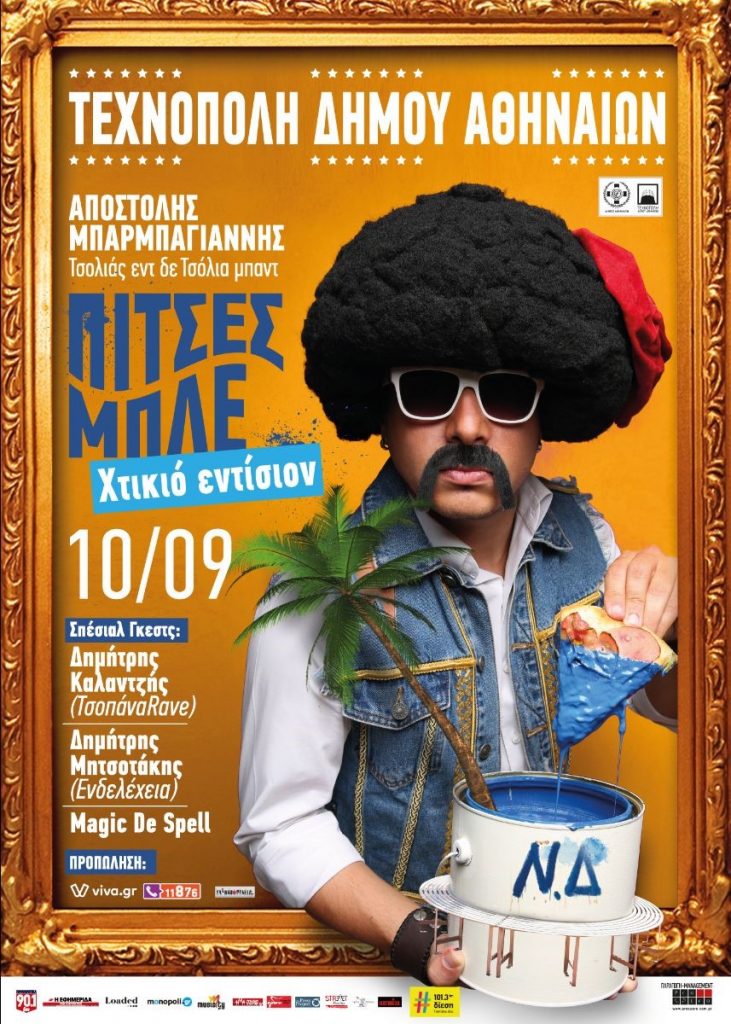 | Ο punk φουστανελάς, με μάσκα στα μουστάκια, γάντια στα χεράκια και αντισηπτικό στα τσίγκινα παγκάκια, έρχεται στην Τεχνόπολη στο Γκάζι πεζός από τον Μεγάλο περίΠΑΤΟ, ποτίζει μαραμένα γιούλια και βιόλες στις ζαρτινιέρες της Πανεπιστημίου και σατιρίζει την πολιτική επικαιρότητα, πολύ σχολαστικά! Μια μουσικό-σατιρική, social distancing παράσταση λοξού πολιτικού λόγου & σατιρικού τραγουδιού. Ένας επιθεωρησιακός αθυρόστομος και καυστικός μονόλογος μπλεγμένος με μουσικές. Ιτνεράξιον με το κοινό, λάιβ φάρσες, φοίνικες, πουλάδες, μπαλέτα, κρούσματα, μποτιλιάρισμα, μολότοφ και βίντεο με πρωταγωνιστή τον δημοσιογράφο-ΜΑΤ, Μπαλούρδο. Ένα πολυθέαμα φτιαγμένο με αγνά υλικά από την μητέρα στύση. Σπέσιαλ Γκεστς: Δημήτρης Καλαντζής (ΤσοπάναRave) Δημήτρης Μητσοτάκης (Ενδελέχεια) Magic De Spell «Πίτσες Μπλε – Χτικιό edition». Τσολιάς εν δε Τσόλια μπάντ! Θα επιβληθούν: κυκλοφοριακές ρυθμίσεις Θα καταπατηθούν: ανθρώπινα δικαιώματα Θα απαγορευτούν: οι συναθροίσεις Θα μοιραστούν: μάσκες (βενετσιάνικες) «Πίτσες Μπλε – Χτικιό εντίσιον» Τσολιάς εν δε Τσόλια μπάντ! |