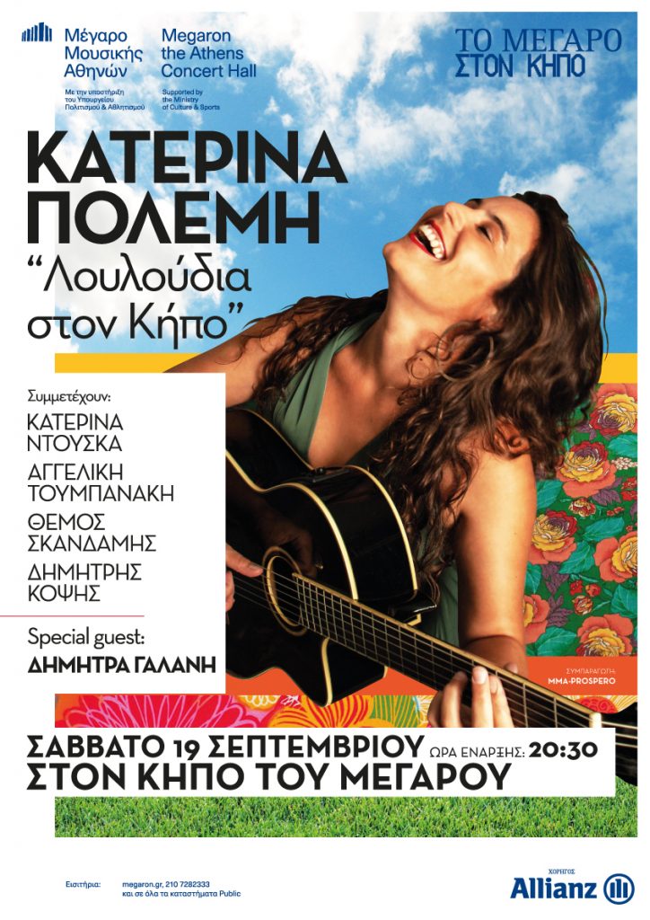 Μια από τις πιο όμορφες, δροσερές και αναζωογονητικές μουσικές βραδιές μας περιμένει το Σάββατο 19 Σεπτεμβρίου στις 8:30 το βράδυ στον πανέμορφο Κήπο του Μεγάρου! Η Ελληνοβραζιλιάνα Κατερίνα Πολέμη, το κορίτσι με τα πολλά ταλέντα που έχει ήδη προκαλέσει αίσθηση με τις μουσικές, τα τραγούδια και τη μοναδική σκηνική της παρουσία, προσκαλεί τους υπέροχους φίλους της, τραγουδιστές, δημιουργούς και μουσικούς και παρουσιάζει μαζί τους τη συναυλία «Λουλούδια στον Κήπο». Μια συναυλία ένωσης, παρέας, γιορτής και επανεκκίνησης, με μελωδίες και ρυθμούς του κόσμου, δράση, χιούμορ, δυναμισμό, αυτοσχεδιασμό, θεατρικότητα και άφθονο ταλέντο!