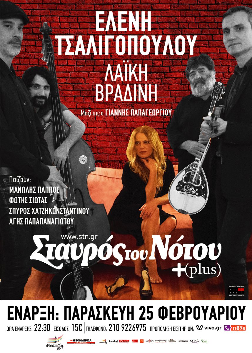 | Συμμετέχουν: ΜΑΝΩΛΗΣ ΠΑΠΠΟΣ – ΦΩΤΗΣ ΣΙΩΤΑΣ – ΓΙΑΝΝΗΣ ΠΑΠΑΓΕΩΡΓΙΟΥ – ΣΠΥΡΟΣ ΧΑΤΖΗΚΩΝΣΤΑΝΤΙΝΟΥ – ΑΓΗΣ ΠΑΠΑΠΑΝΑΓΙΩΤΟΥ Η προπώληση ξεκίνησε! Από την Παρασκευή 25 Φεβρουαρίου η Ελένη Τσαλιγοπούλου μας προσκαλεί στο Σταυρό του Νότου Plus, σε ένα λαϊκό πρόγραμμα γεμάτο σπουδαία τραγούδια που όλοι έχουμε αγαπήσει. Μαζί της πέντε σημαντικοί δεξιοτέχνες μουσικοί και δημιουργοί μουσικής, γνώστες και ανανεωτές του είδους: Ο Μανώλης Πάππος με το μπουζούκι του, ο Φώτης Σιώτας με το βιολί του, ο Γιάννης Παπαγεωργίου με τη λαϊκή κιθάρα του, ο Σπύρος Χατζηκωνσταντίνου με την ηλεκτρική κιθάρα του και ο Άγης Παπαπαναγιώτου με το κοντραμπάσο του, ο καθένας με τον δικό του ιδιαίτερο τρόπο, την ποιότητα και το μεγάλο ταλέντο του. Αφορμή για τη δημιουργία του συγκεκριμένου προγράμματος ο νέος δίσκος που ετοιμάζει η Ελένη και αναμένεται να κυκλοφορήσει σύντομα, με τραγούδια του πολύ αγαπημένου της συνθέτη Απόστολου Καλδάρα, ένα όνειρο ετών για εκείνη που σε λίγο καιρό θα πραγματοποιηθεί. Η προετοιμασία αυτού του δίσκου την ώθησε να εξερευνήσει ακόμη περισσότερο τους δρόμους του λαϊκού, του ρεμπέτικου αλλά και του σύγχρονου λαϊκότροπου τραγουδιού. Και το αποτέλεσμα αποτυπώνεται τώρα στη σκηνή, σε ένα πρόγραμμα με τραγούδια που άντεξαν στο χρόνο και προχωρούν στο μέλλον, αλλά και με νεότερα τραγούδια που εντάσσονται στο κλίμα, μέσα από την φρέσκια «ανάγνωση» και τις ερμηνείες μίας πληθωρικά ταλαντούχας ομάδας. Ακόμη, σε κάθε παράσταση θα υπάρχει και ένας καλεσμένος-έκπληξη από τη νέα γενιά ερμηνευτών! «Λαϊκή βραδινή» στο Σταυρό του Νότου Plus, με την Ελένη Τσαλιγοπούλου και τους εμπνευσμένους φίλους της να μας προσκαλούν να αφεθούμε στη ζεστασιά των πιο αγαπημένων τραγουδιών και να γίνουμε όλοι μια μεγάλη παρέα, πάνω και κάτω από τη σκηνή! |