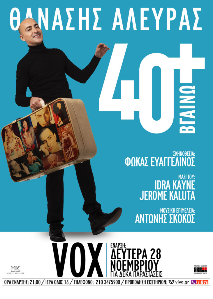 | INFO: Από τη Δευτέρα 28 Νοεμβρίου στο VOX VOX-ΙΕΡΑ ΟΔΟΣ 16-ΤΗΛ. ΚΡΑΤΗΣΕΩΝ: 210.3475900 Τιμές εισιτηρίων: Α’ ΖΩΝΗ: 25€ / Β’ ΖΩΝΗ: 20€ / Γ’ ΖΩΝΗ: 15€ / Δ’ ΖΩΝΗ(Περιορισμένη Ορατότητα): 15€ / ΖΩΝΗ ΟΡΘΙΩΝ: 13€ Προπώληση https://www.viva.gr/tickets/music/thanasis-aleuras-40-bgaino/ Ώρα Έναρξης: 21.00 —————————————————————————- ΣΥΝΤΕΛΕΣΤΕΣ ΜΟΥΣΙΚΗ ΕΠΙΜΕΛΕΙΑ: ΑΝΤΩΝΗΣ ΣΚΟΚΟΣ ΣΚΗΝΟΘΕΣΙΑ: ΦΩΚΑΣ ΕΥΑΓΓΕΛΙΝΟΣ ΗΧΟΛΗΨΙΑ: ΓΙΑΝΝΗΣ ΠΑΞΕΒΑΝΗΣ, ΘΡΑΣΟΣ ΑΜΠΑΤΖΗΣ ΣΧΕΔΙΑΣΜΟΣ ΦΩΤΩΝ: ΠΕΡΙΚΛΗΣ ΜΑΘΙΕΛΛΗΣ ARTWORK: ΚΩΝΣΤΑΝΤΙΝΟΣ ΓΕΩΡΓΑΝΤΑΣ ΣΧΕΔΙΑΣΜΟΣ VIDEO: ΠΑΝΤΕΛΗΣ ΜΑΚΚΑΣ ΦΩΤΟΓΡΑΦΙΕΣ: ΡΟΥΛΑ ΡΕΒΗ ΕΝΔΥΜΑΤΟΛΟΓΙΚΗ ΕΠΙΜΕΛΕΙΑ: ΓΙΩΡΓΟΣ ΣΕΓΡΕΔΑΚΗΣ ΦΩΝΗΤΙΚΗ ΔΙΔΑΣΚΑΛΙΑ: ΑΜΑΛΙΑ ΒΙΝΟΣ ΕΠΙΚΟΙΝΩΝΙΑ & ΠΡΟΒΟΛΗ ΤΗΣ ΠΑΡΑΣΤΑΣΗΣ ΣΤΑ MEDIA: ZUMA COMMUNICATIONS: ΧΑΡΑ ΖΟΥΜΑ, ΝΙΝΑ ΑΛΤΑΝΗ PROSPERO: ΕΛΕΝΗ ΓΙΑΝΝΟΠΟΥΛΟΥ MK GROUP of COMPANIES : ΕΛΕΝΗ ΤΩΡΟΥ, ΜΑΝΟΣ ΜΑΓΙΑΤΗΣ, ΕΛΕΝΗ ΒΛΑΧΟΠΟΥΛΟΥ MANAGEMENT: PROSPERO ΠΑΡΑΓΩΓΗ: PROSPERO / ΚΑΤΕΡΙΝΑ ΣΤΑΜΑΤΑΚΗ MK GROUP of COMPANIES / ΗΛΙΑΣ ΜΑΡΟΣΟΥΛΗΣ, ΑΓΓΕΛΟΣ ΚΟΤΑΡΙΔΗΣ ΔΙΕΥΘΥΝΣΗ ΠΑΡΑΓΩΓΗΣ: ΘΑΝΑΣΗΣ ΜΑΡΟΣΟΥΛΗΣ – ΧΑΡΑ ΜΑΓΑΛΙΟΥ |