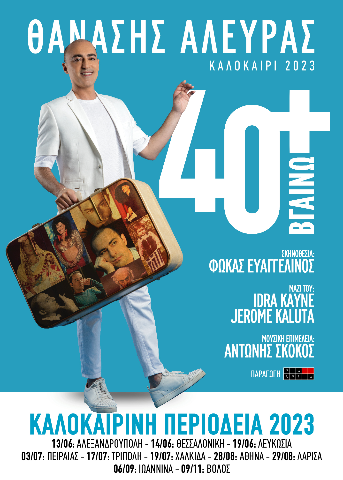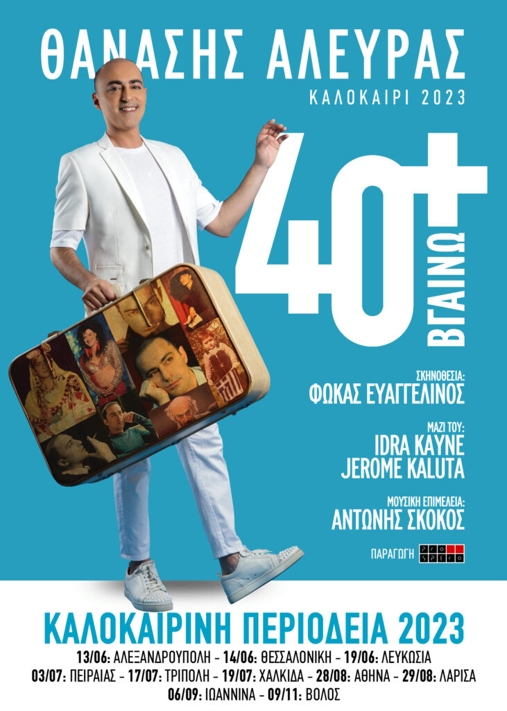 | Καλοκαίρι 2023 «40+Βγαίνω!» Ο συναρπαστικός Θανάσης Αλευράς στην πρώτη του καλοκαιρινή περιοδεία με την προσωπική του μουσικοθεατρική παράσταση, που γνώρισε τεράστια επιτυχία! Η προπώληση έχει ξεκινήσει Σκηνοθεσία: Φωκάς Ευαγγελινός Μουσική Επιμέλεια: Αντώνης Σκόκος Συμμετέχουν: Idra Kayne – Jerome Kaluta Ύστερα από τις sold out χειμερινές εμφανίσεις του στο VOX αλλά και τα τηλεοπτικά «Νούμερα» του Φοίβου Δεληβοριά, ο πολυτάλαντος Θανάσης Αλευράς παρουσιάζει σε όλη την Ελλάδα, για πρώτη φορά, ένα παράξενο, αυτοβιογραφικό, εσώψυχο, μουσικοσατιρικό πρόγραμμα! |