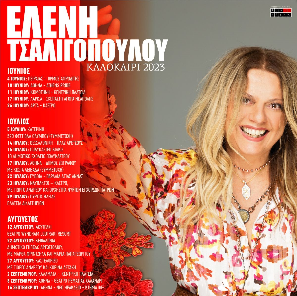Η Ελένη Τσαλιγοπούλου, ύστερα από μία πορεία που μετρά πια 30 χρόνια ιδιαίτερα επιτυχημένης παρουσίας στην ελληνική μουσική σκηνή, επιλέγει φέτος να παρουσιάσει τις πιο ξεχωριστές στιγμές της σε μία συναρπαστική καλοκαιρινή περιοδεία σε όλη την Ελλάδα.