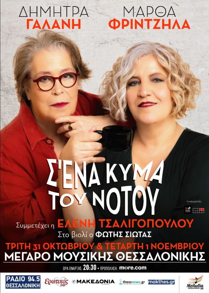 H Δήμητρα Γαλάνη και η Μάρθα Φριντζήλα την Τρίτη 31 Οκτωβρίου και την Τετάρτη 1 Νοεμβρίου, σε συνέχεια των δύο sold out εμφανίσεών τους στο Μέγαρο Μουσικής Αθηνών, έρχονται πάνω «Σ’ ένα κύμα του Νότου» στο Μέγαρο Μουσικής Θεσσαλονίκης για ένα ακόμα συναρπαστικό μουσικό ταξίδι. Οι δύο ερμηνεύτριες μας προσκαλούν να τραγουδήσουμε μαζί τους διαχρονικά τραγούδια και διασκευές με νέα προσέγγιση, μέσα από την πρωτότυπη ματιά των ταλαντούχων μουσικών που τις πλαισιώνουν