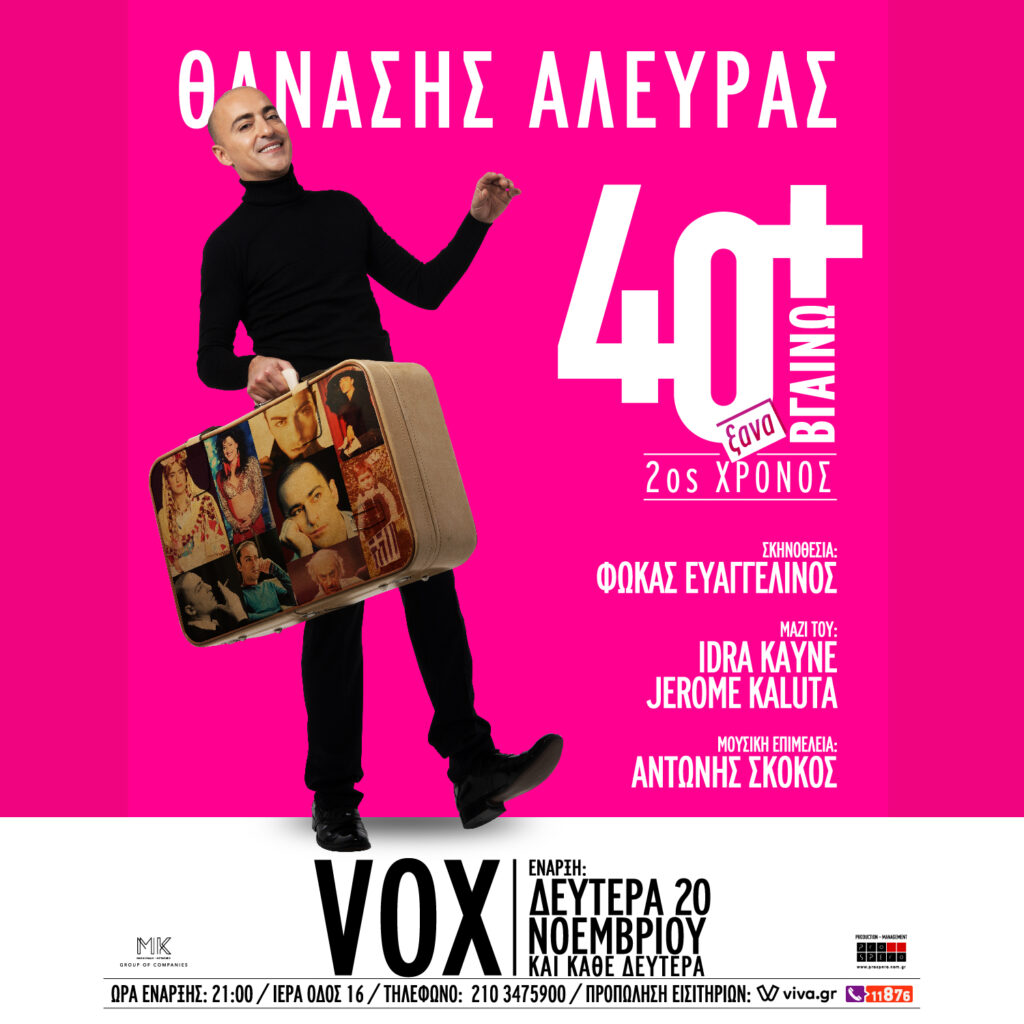 Και όπως φάνηκε το ταξίδι αυτό έμελλε να αφορά και πάρα πολλούς και πολλές ακόμα, 40αρηδες και μη, καθώς οι περσινές παραστάσεις γνώρισαν τεράστια επιτυχία κάνοντας τις Δευτέρες αγαπημένη ημέρα της εβδομάδας και το VOX προορισμό ακριβώς στις 21.00. Διαδοχικά sold-out, γέλιο, συγκίνηση, flash-back, επικά στιγμιότυπα, τραγούδια και παρέες που ενώνονταν σε μία, ήταν τα χαρακτηριστικά μιας από της πιο επιτυχημένες παραστάσεις της χρονιάς που ταξίδεψε με επιτυχία και το καλοκαίρι σε άλλα μέρη της Ελλάδας και στην Κύπρο. Ήταν φυσικό και επόμενο λοιπόν, να επιστρέψει στο VOX το Νοέμβριο του 2023. Το ζητούσε το κοινό, οι συντελεστές και όλοι όσοι δεν χόρτασαν ή δεν πρόλαβαν να το δουν τον περσινό χειμώνα. Από Δευτέρα 20 Νοεμβρίου και κάθε Δευτέρα, 40+ξαναΒγαίνω με τον Θανάση Αλευρά, στο μέρος που πάλι θα μαζευόμαστε στην αρχή της εβδομάδας και θα γινόμαστε μία παρέα!