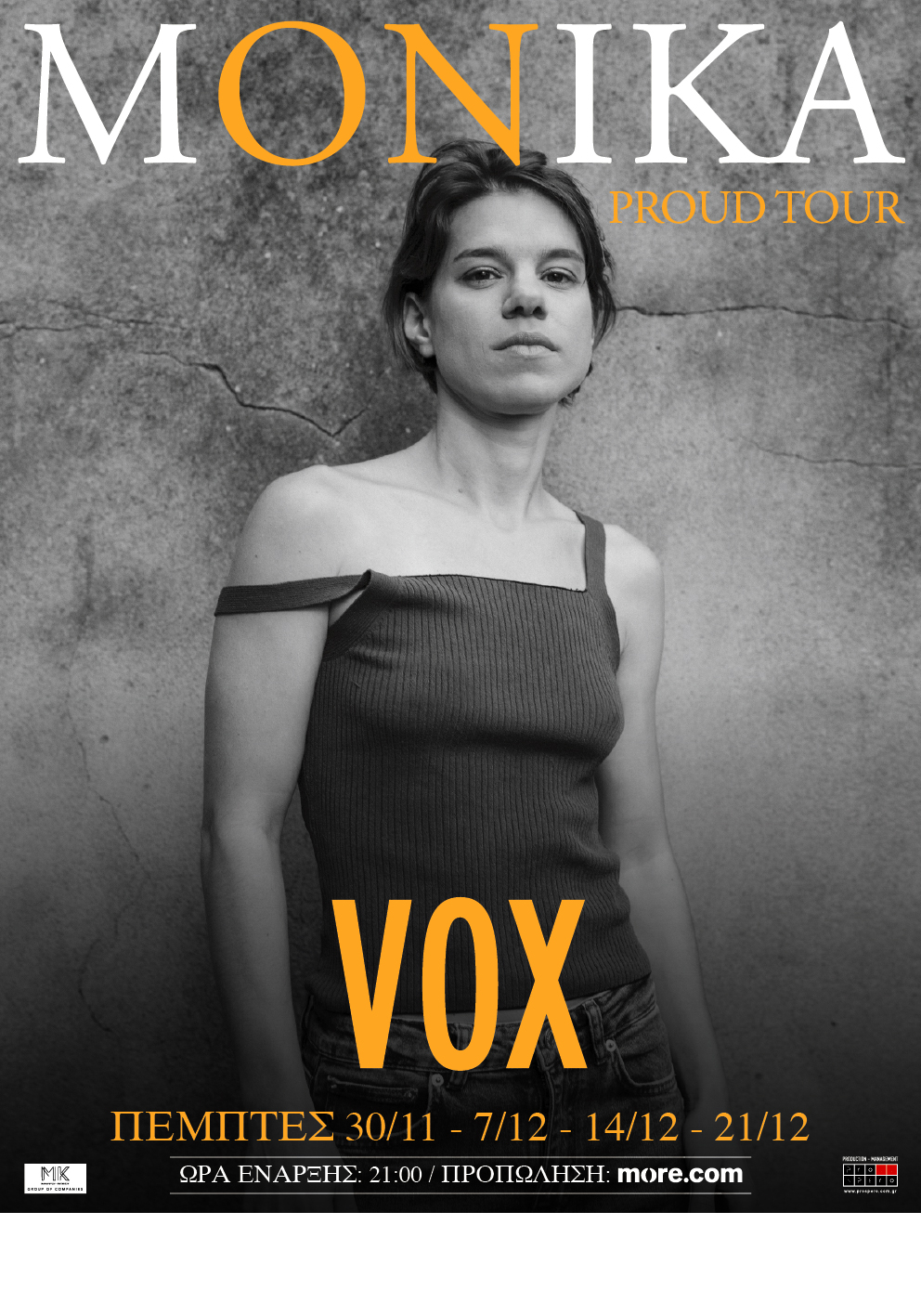 Από Πέμπτη 30 Νοεμβρίου και για 4 παραστάσεις, η Monika θα βρίσκεται στο VOX live & proud. Ελάτε να ταξιδέψουμε μαζί της στο συναρπαστικό μουσικό της σύμπαν!