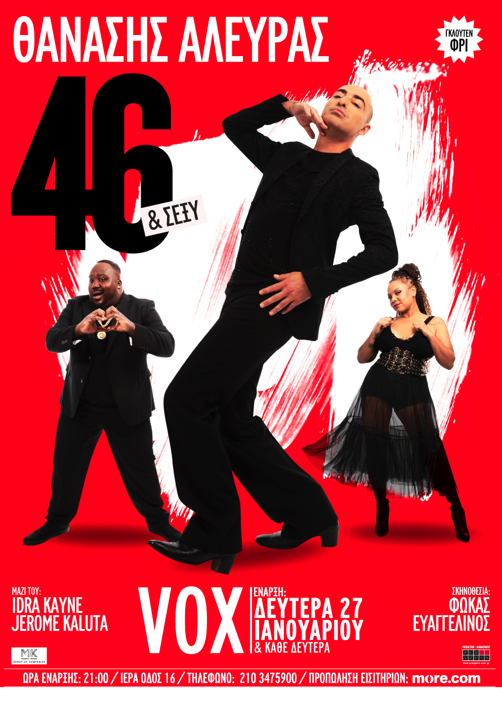 Μετά από δύο πολύ επιτυχημένες χρονιές με την αυτοβιογραφική μουσικοσατιρική παράσταση “40+Βγαίνω”, ο ΘΑΝΑΣΗΣ ΑΛΕΥΡΑΣ επιστρέφει στην σκηνή του VOX πιο …ανώριμος αλλά και πιο σέξι από ποτέ! “46+ΣΕΞΥ” είναι ο τίτλος της νέας του παράστασης, ένα mix and match μουσικό, σατιρικό θέαμα, που έρχεται να σκανδαλίσει και να ταράξει τις ήσυχες Δευτέρες μας.