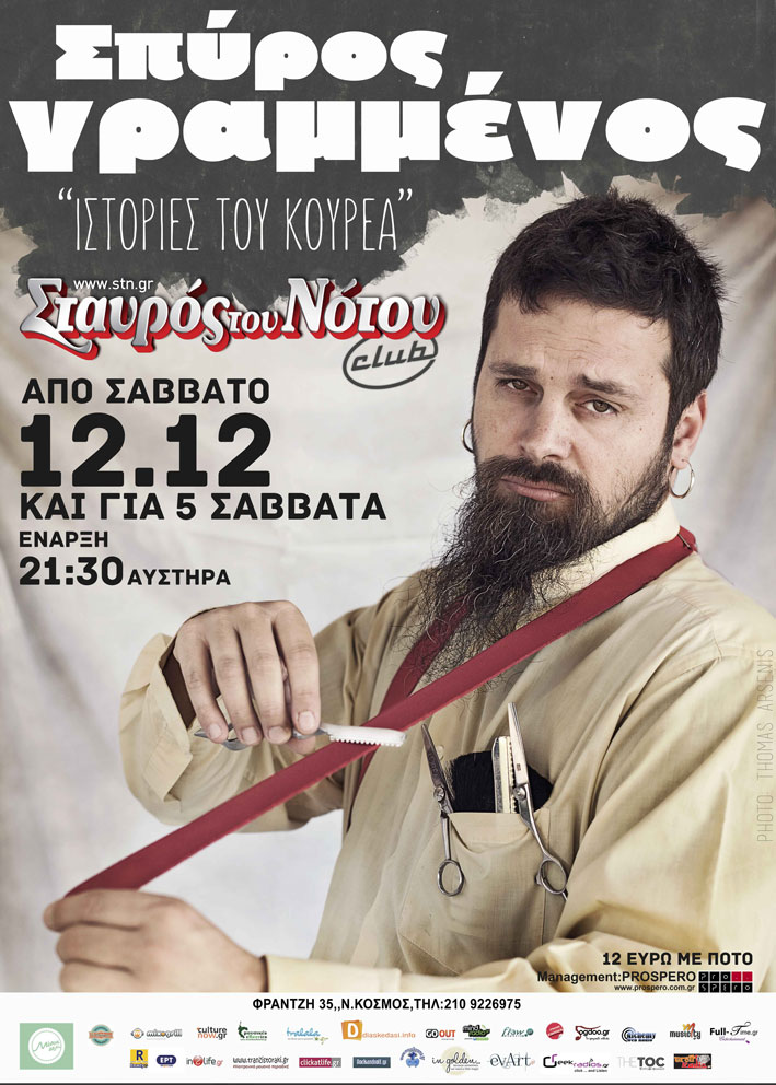 Ο απρόβλεπτος performer, ευρηματικός τραγουδοποιός και sui generis persona, Σπύρος Γραμμένος, παρουσιάζει από το Σάββατο 12 Δεκεμβρίου και για πέντε μόνο Σάββατα στο Σταυρό του Νότου Club… τη νέα του υπερπαραγωγή: «Ιστορίες του Κουρέα»!